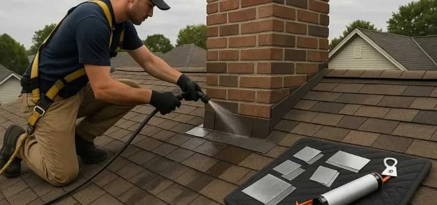 We examine crown slope, cap fit, mortar joints, brick or stone surfaces, and flashing transitions at the roofline. In Commerce Valley, Markham this area is often the origin of leaks.